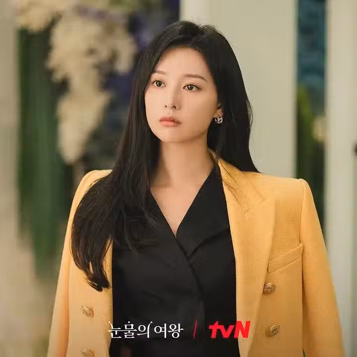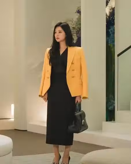 金智媛在《淚之女王》中,時常以西裝外套霸氣出場,並且是以披在肩上的方式,為整體穿搭增添一抹亮點,這件來自Balmain的黃色西裝外套,修身墊肩設計讓金智媛展現女王氣場。