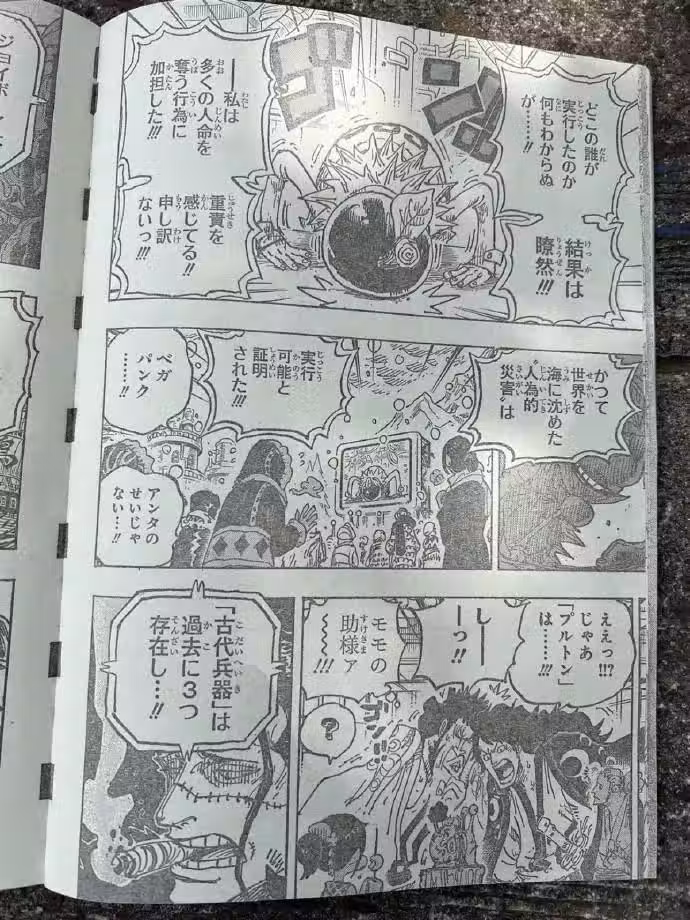 老貝說空白100年戰爭還沒結束,這句話把全世界搞懵了:800年前的人都沒了,戰爭怎麼繼續?為什麼要繼續?老貝沒有接著這個話往下說,也許他知道更多,但尾田不能讓他說下去,空白100年說到這裡該打住了,所以接下來老貝的話題,就轉移到了古代兵器上面。