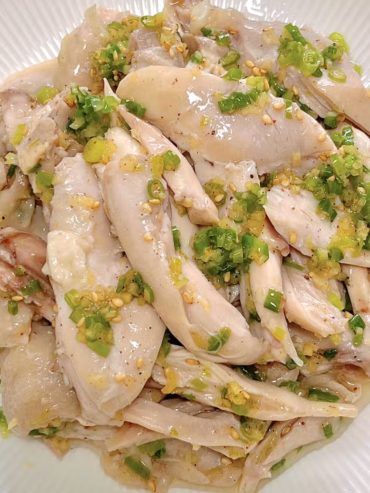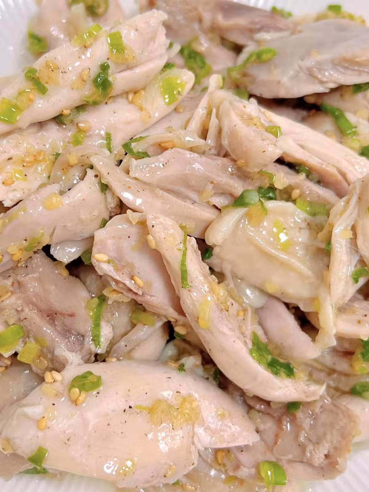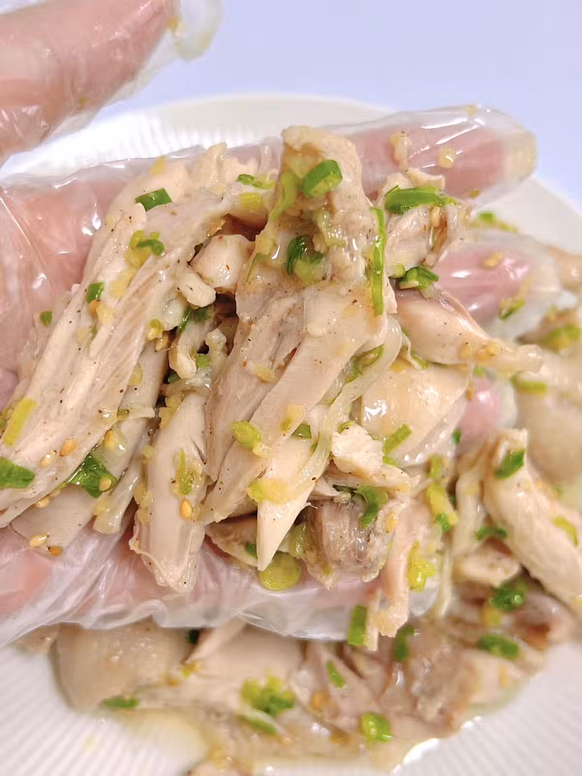 2.撈出過冷水,雞腿肉撕成小塊,倒入調好的蔥姜油料汁,拌均勻就可以啦。