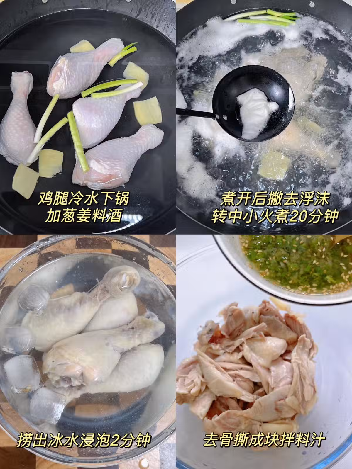 1.雞腿洗乾淨。冷水下鍋加蔥姜料酒,煮開後撇去浮沫,轉中小火煮20分鐘左右。