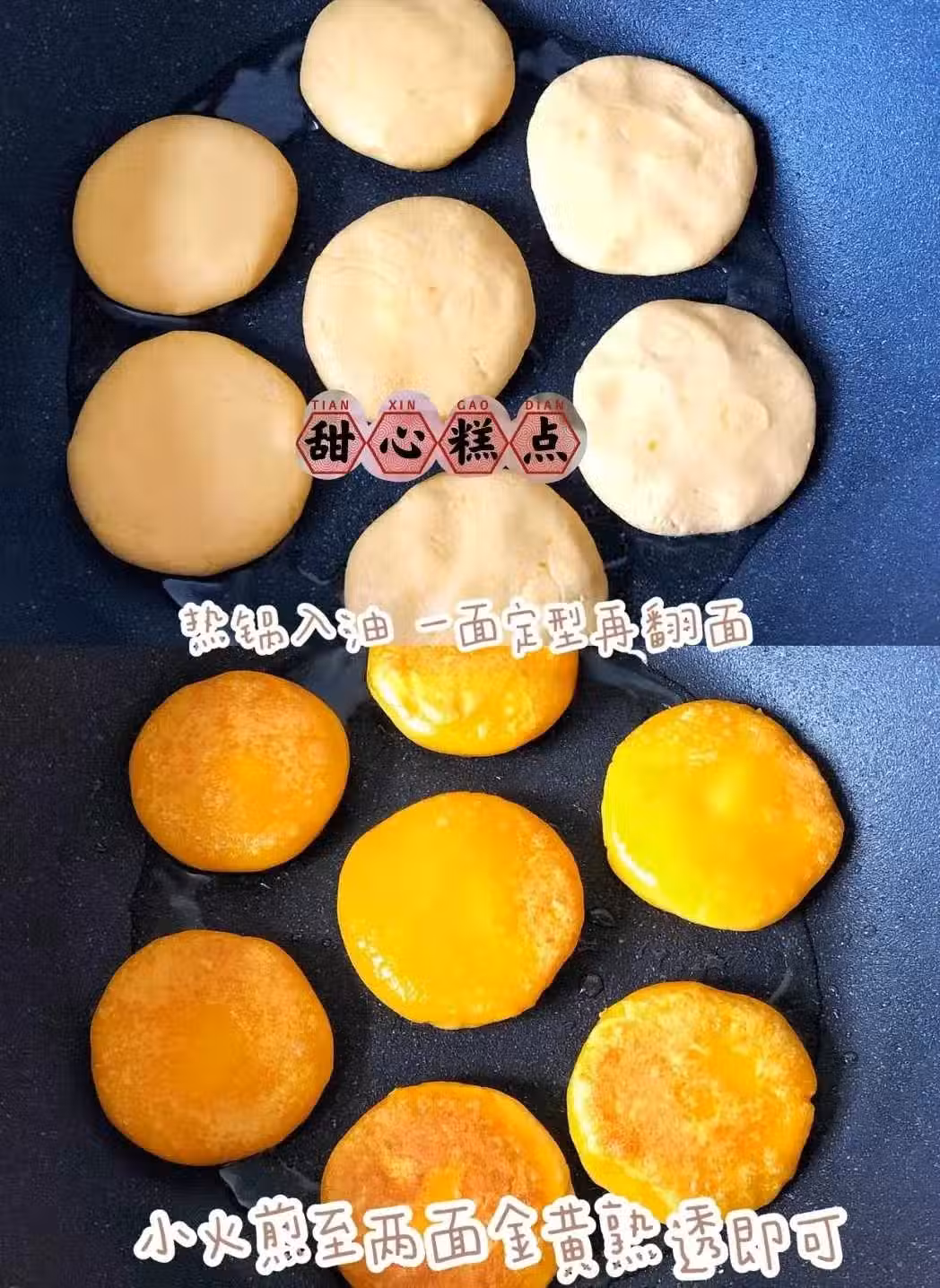 3⃣️、平底鍋加熱入油,小火煎制兩面金黃色完成