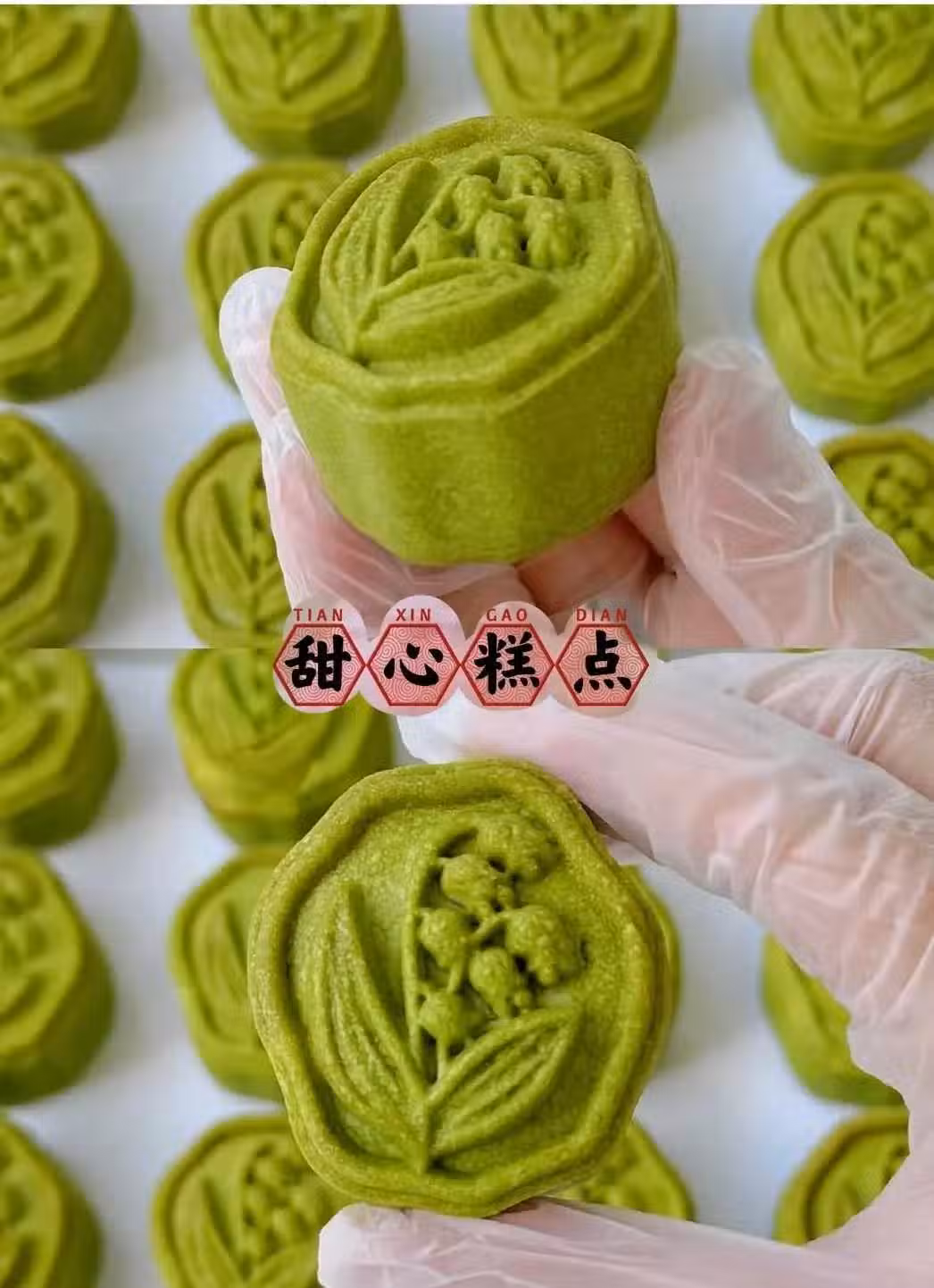 3、取一個抹茶麵團(25g),放入蔓越莓椰蓉餡,包起來,粘乾粉,放入模具中,壓出花紋,放入冰箱冷凍30分鐘