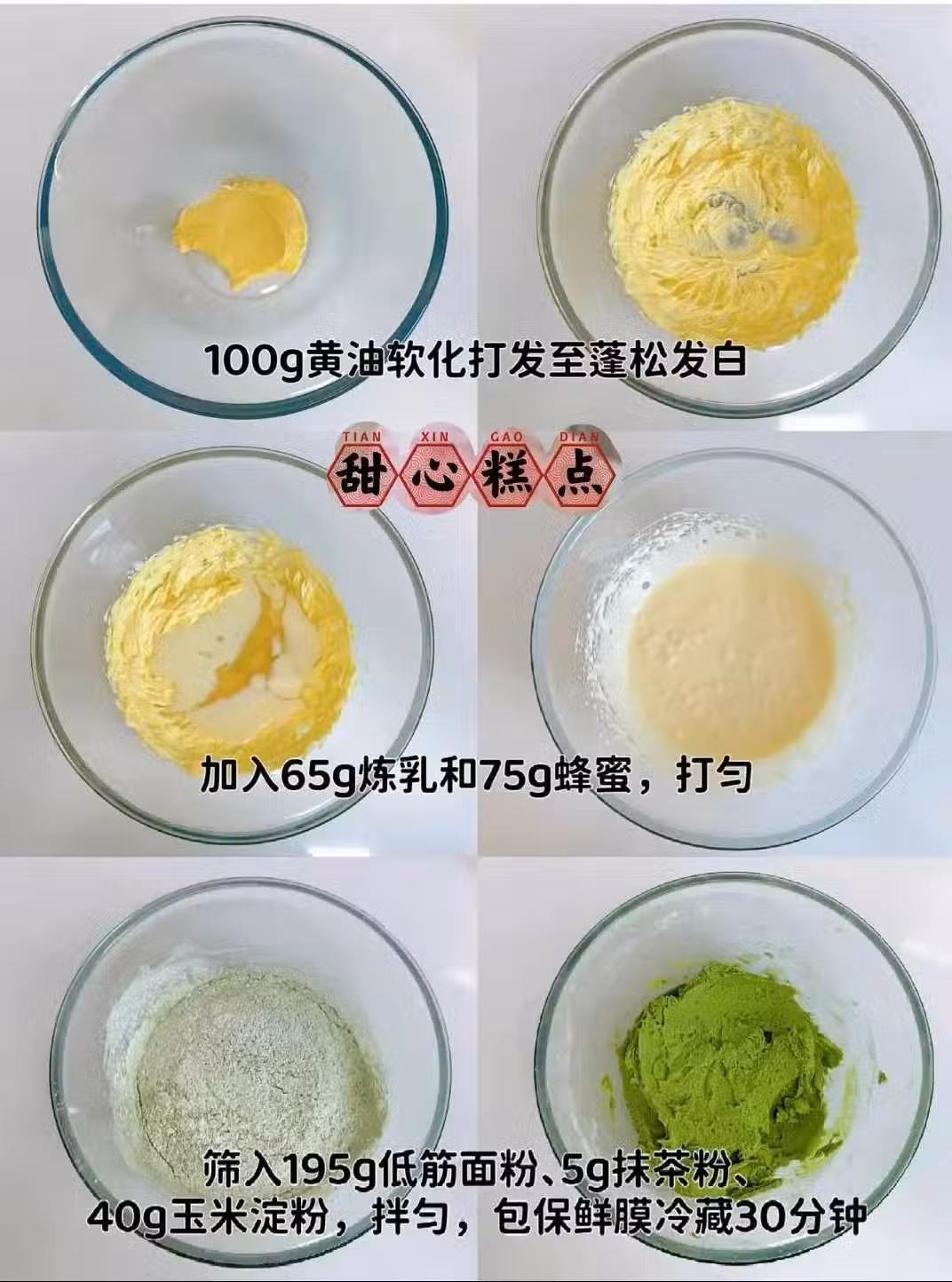 1、100g黃油打發至蓬鬆發白,加入65g煉乳和75g蜂蜜,打勻,篩入195g低筋麵粉、5g抹茶粉、40g玉米澱粉,拌勻,包保鮮膜冷藏30分鐘