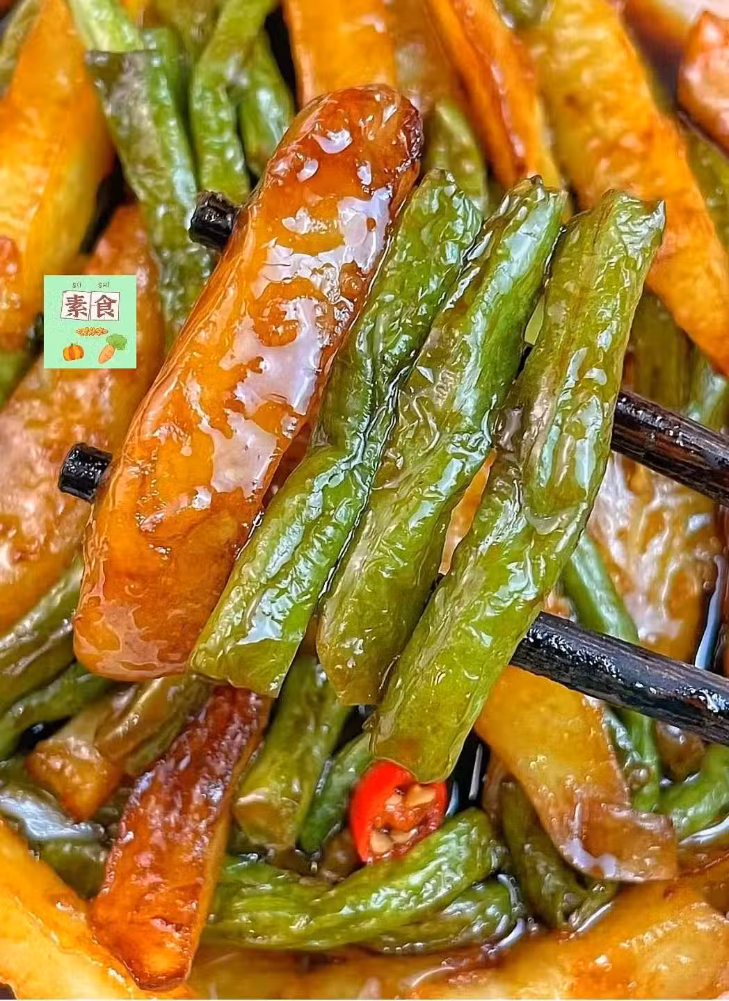 2️⃣土豆切條,小火煎至表面金黃盛出,下入豆角煸炒至表面微皺(8-10分鐘左右)豆角一定要熟透!