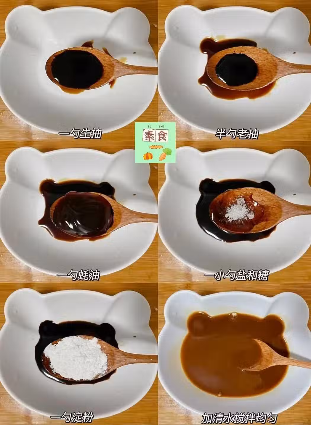 一勺生抽+半勺老抽+一勺蚝油 (素)+一小勺鹽和糖+一勺澱粉+一小碗清水攪拌均勻