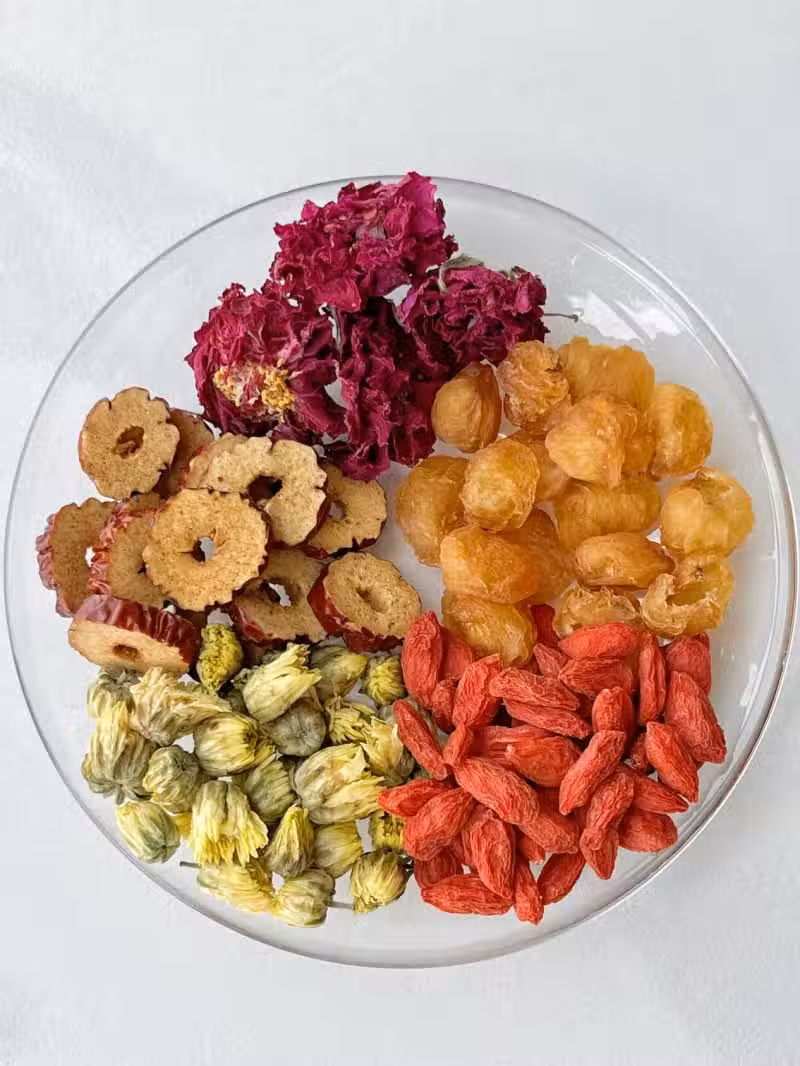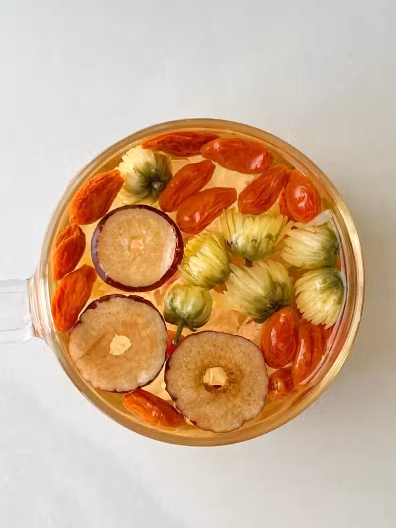 材料:胎菊2g+紅棗3顆+枸杞2g+玫瑰3g+桂圓5g