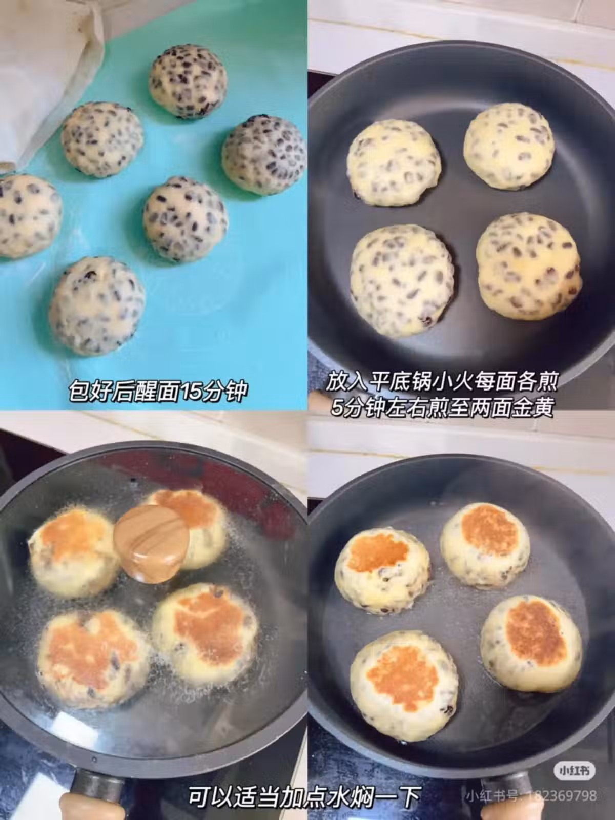 4⃣️包好的餅二次醒發15分鐘,放入平底鍋,小火烙,兩面各烙四五分鐘,煎至兩面金黃後可以適當加點水燜一下,麵餅按壓回彈即可