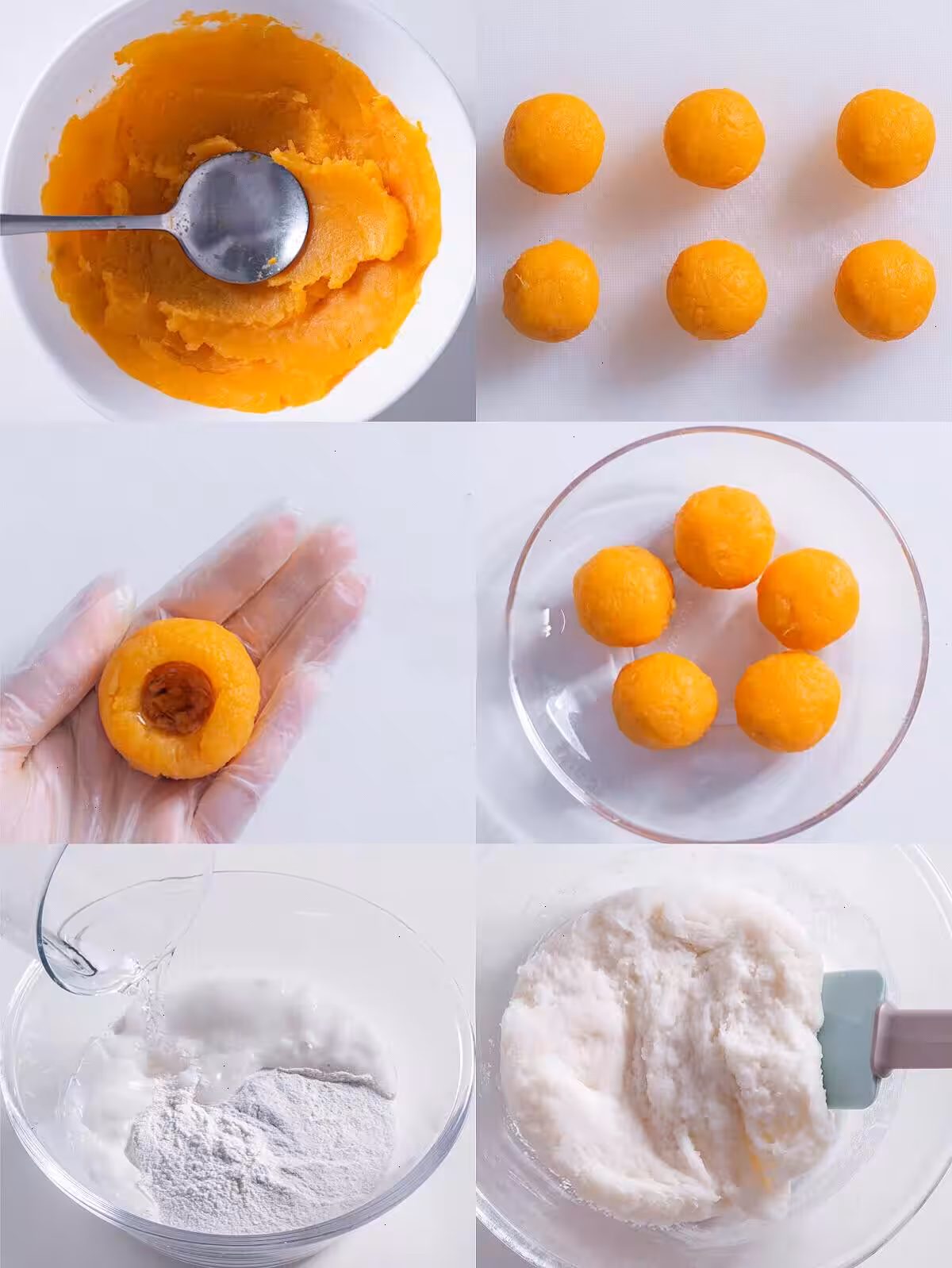 1️⃣紅薯蒸熟壓成泥,分成20g/個,揉圓,中間壓凹,擠入適量桂花醬,包好,備用。