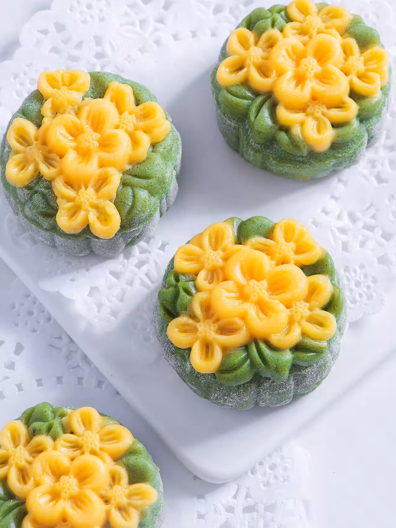 2️⃣冰皮月餅粉加入開水,攪拌成麵糰,分出小劑子,加入南瓜粉、抹茶粉,揉成麵糰。用黃、綠兩種顏色的麵糰組合成桂花造型,填入模具中。