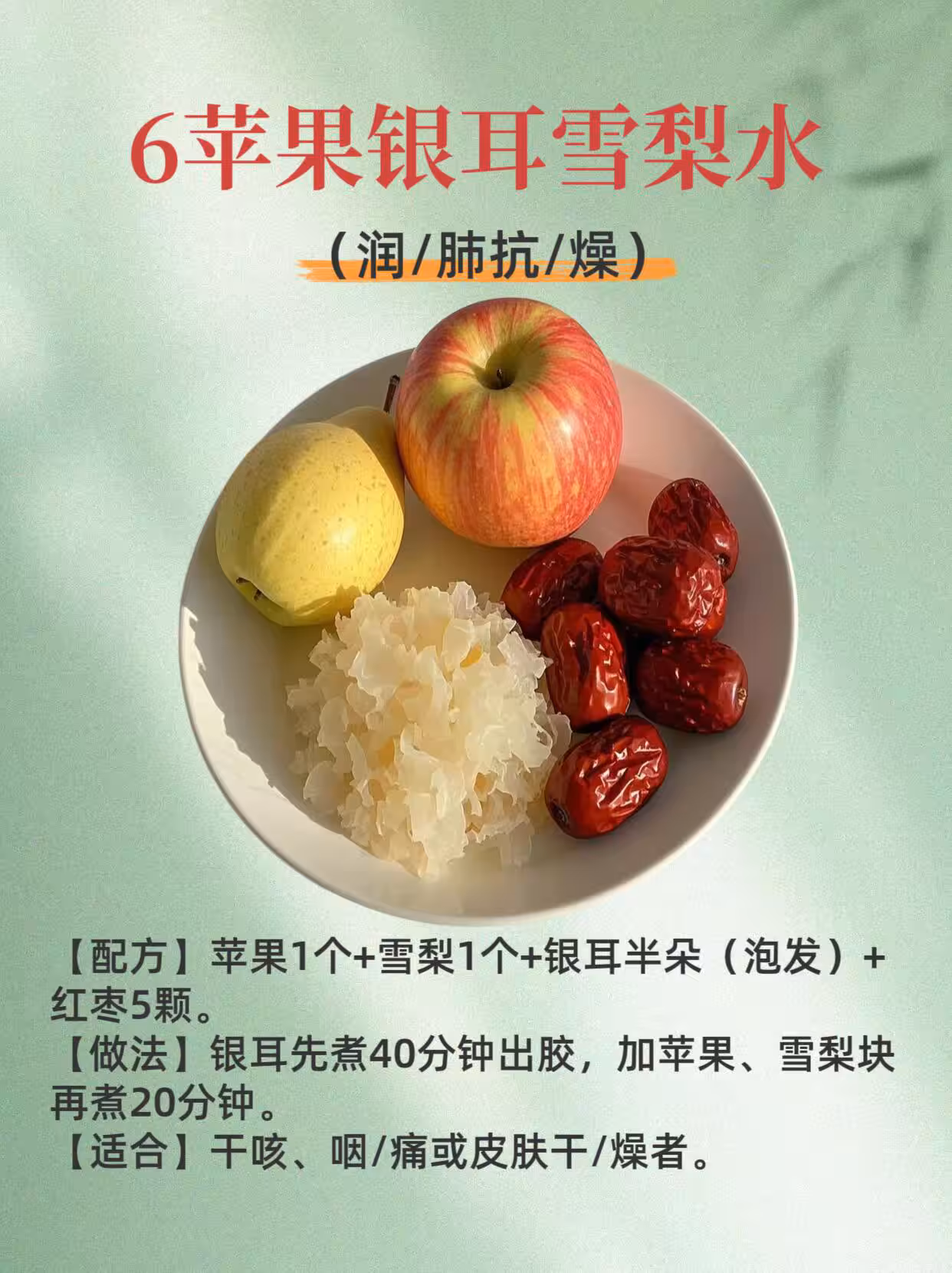 🍎 蘋果黃芪水:蘋果1個+黃芪5-10g+紅棗5顆+枸杞10粒。蘋果帶皮切塊,黃芪泡10分鐘,加水煮20分鐘後加枸杞燜5分鐘。