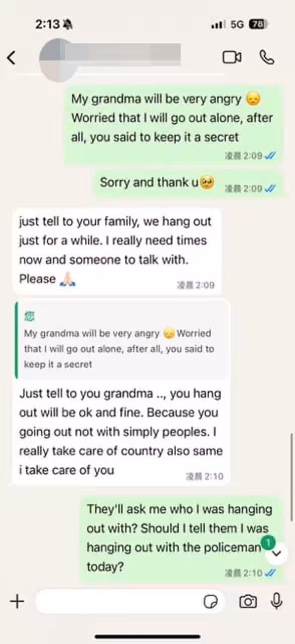 「台灣女遊客聲稱遭警察勒索和性騷擾」一案;女遊客和被指是「「警員」」的聊天記錄大曝光!涉事「「警員」」不僅言語曖昧,甚至連續三小時信息轟炸,試圖強迫女遊客出門陪酒「談心」!
