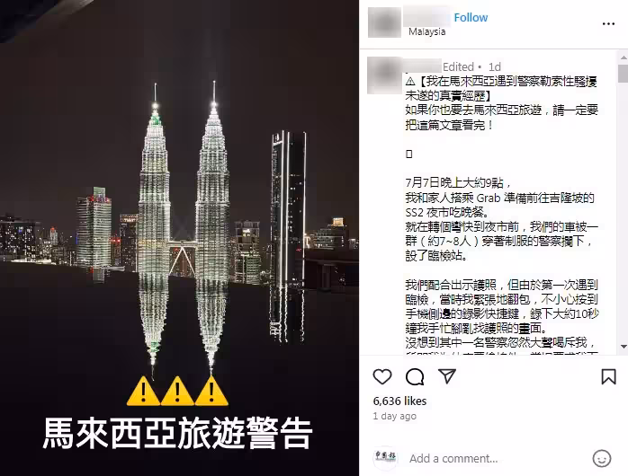 一名台灣女遊客日前在吉隆坡SS2夜市附近,遇警察路障時,指控遭對方勒索、手機被強行查閱,甚至遇上性騷擾未遂;她事後透過社交平台詳述整段驚魂歷程,引髮網民關注!