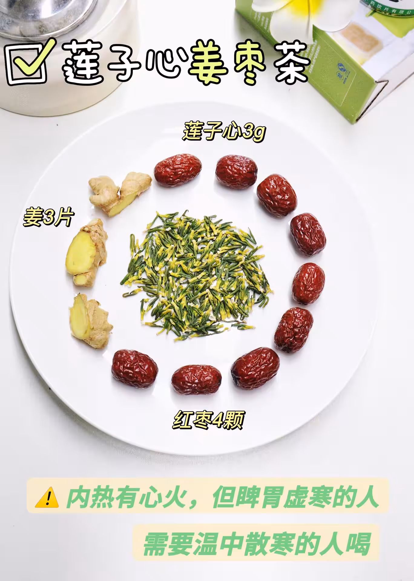 🥣做法:將姜和紅棗煮成姜棗茶,再加入適量的蓮子心