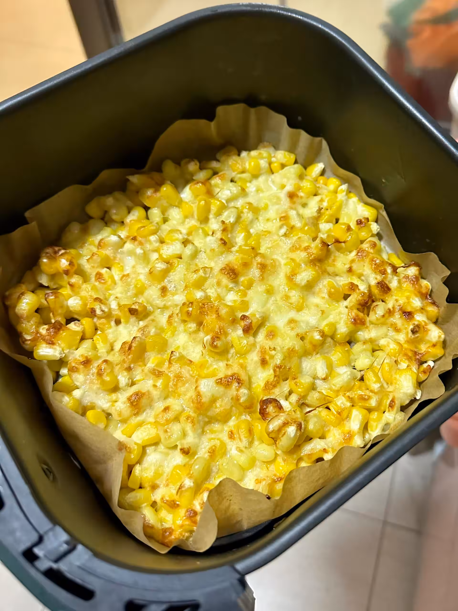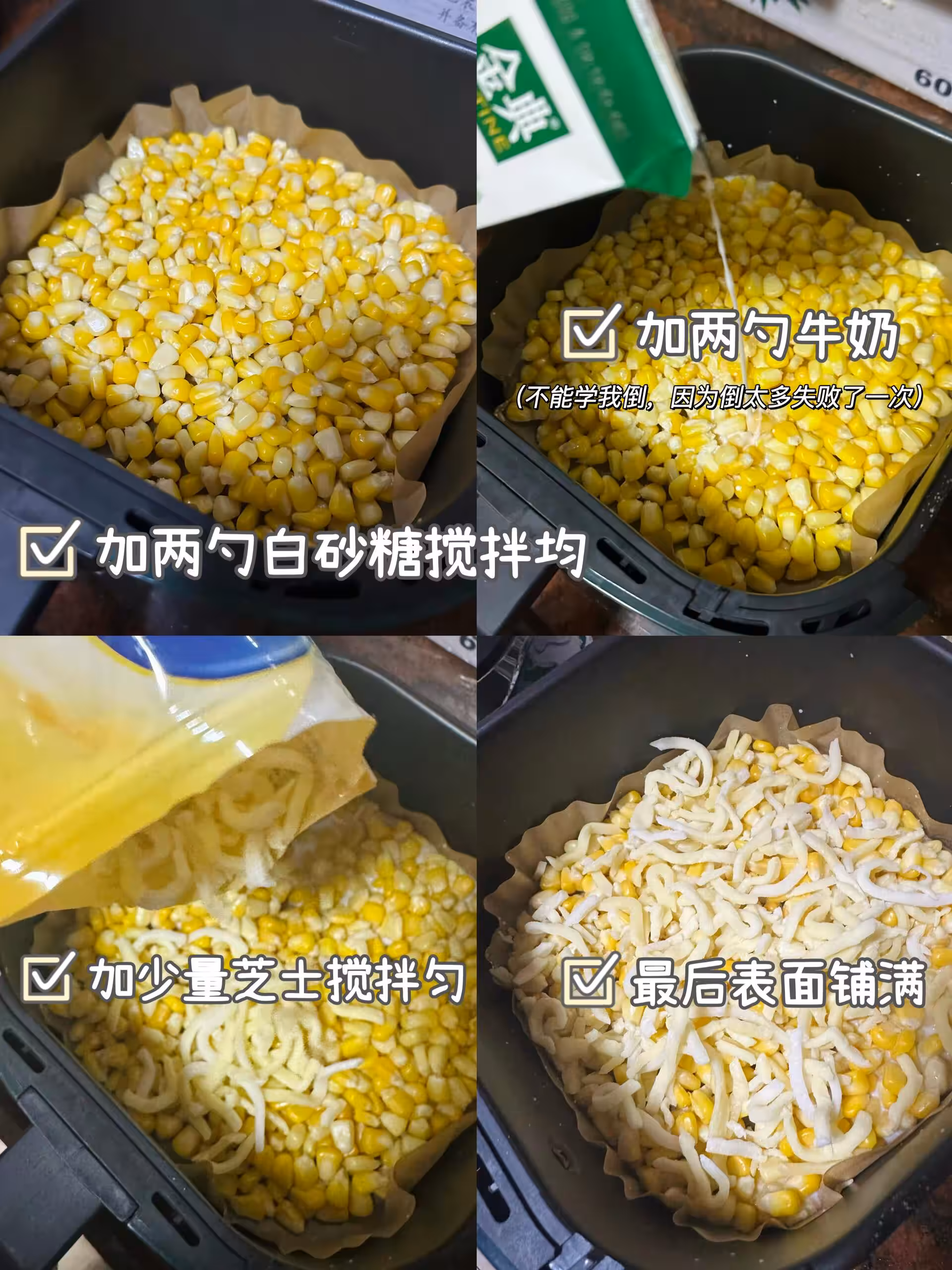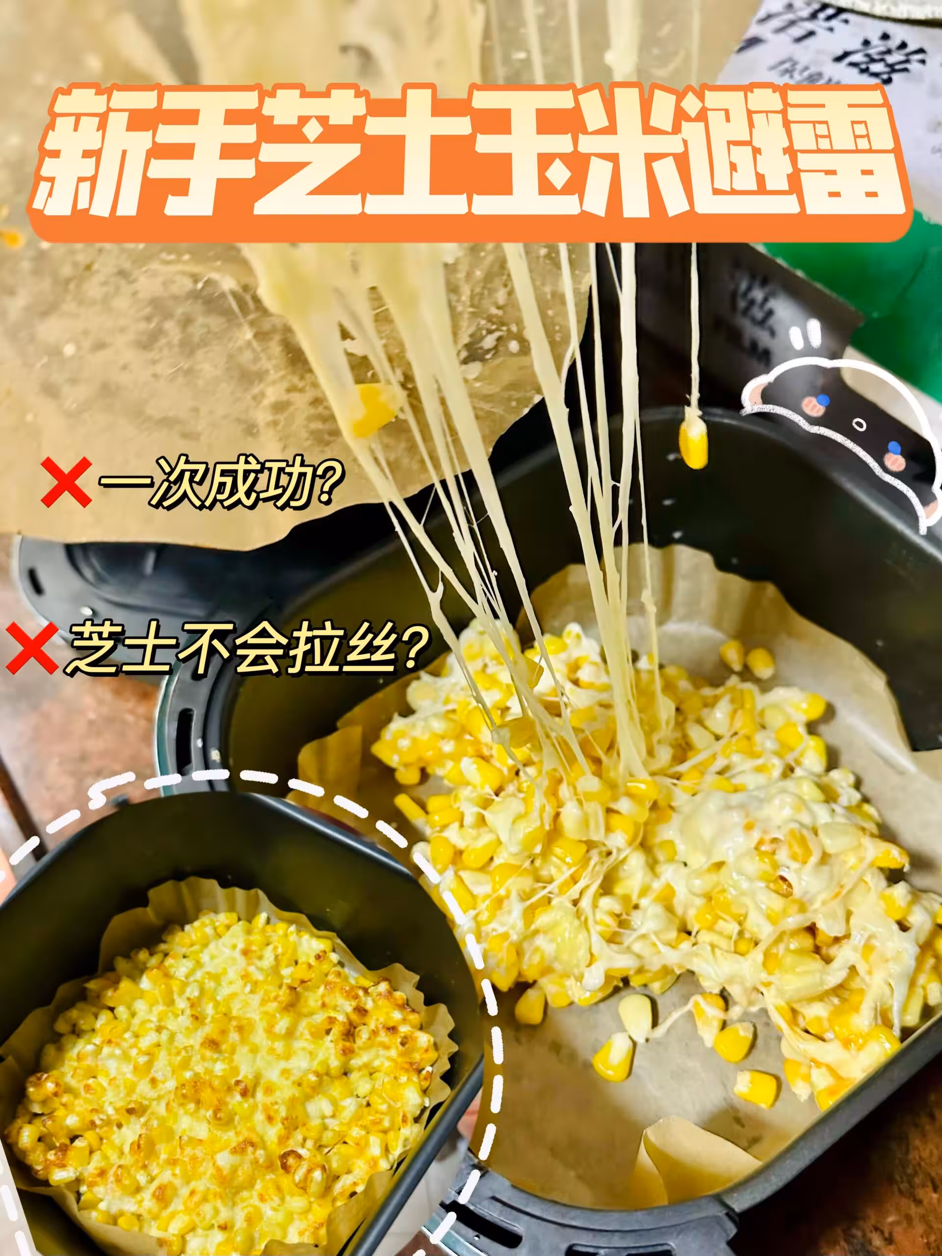 🟡Ps:1.不能加太多牛奶,會烤不幹2.我用的一根玉米剛好,太少會變成一粒粒3.每個人空氣炸鍋功率不同,如果沒烤好,再加幾分鐘繼續烤即可4.趁熱吃,不然無法拉絲