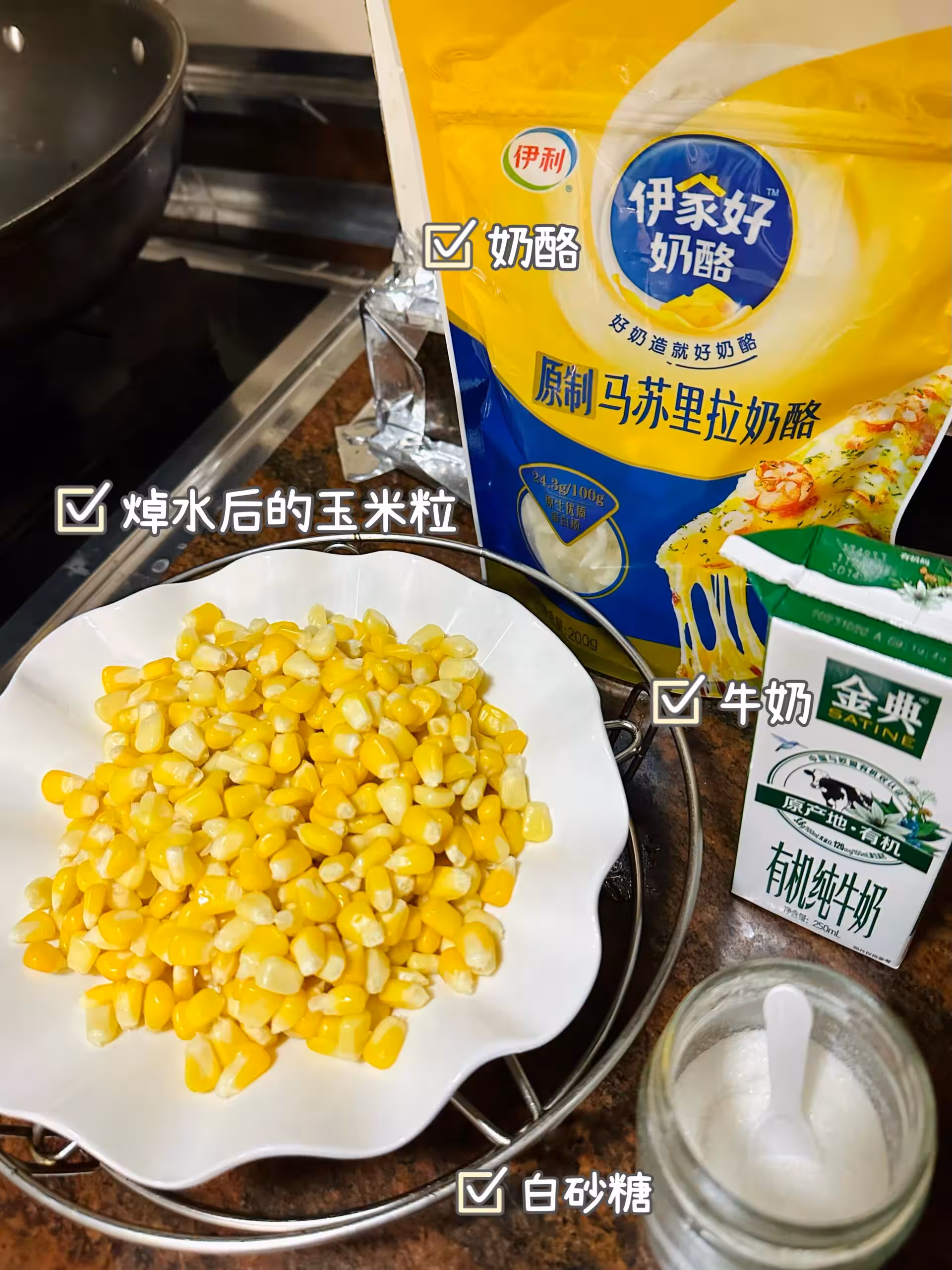 🟡食材:玉米粒(冷凍玉米粒或鮮玉米)、mozzarella cheese、牛奶、白砂糖