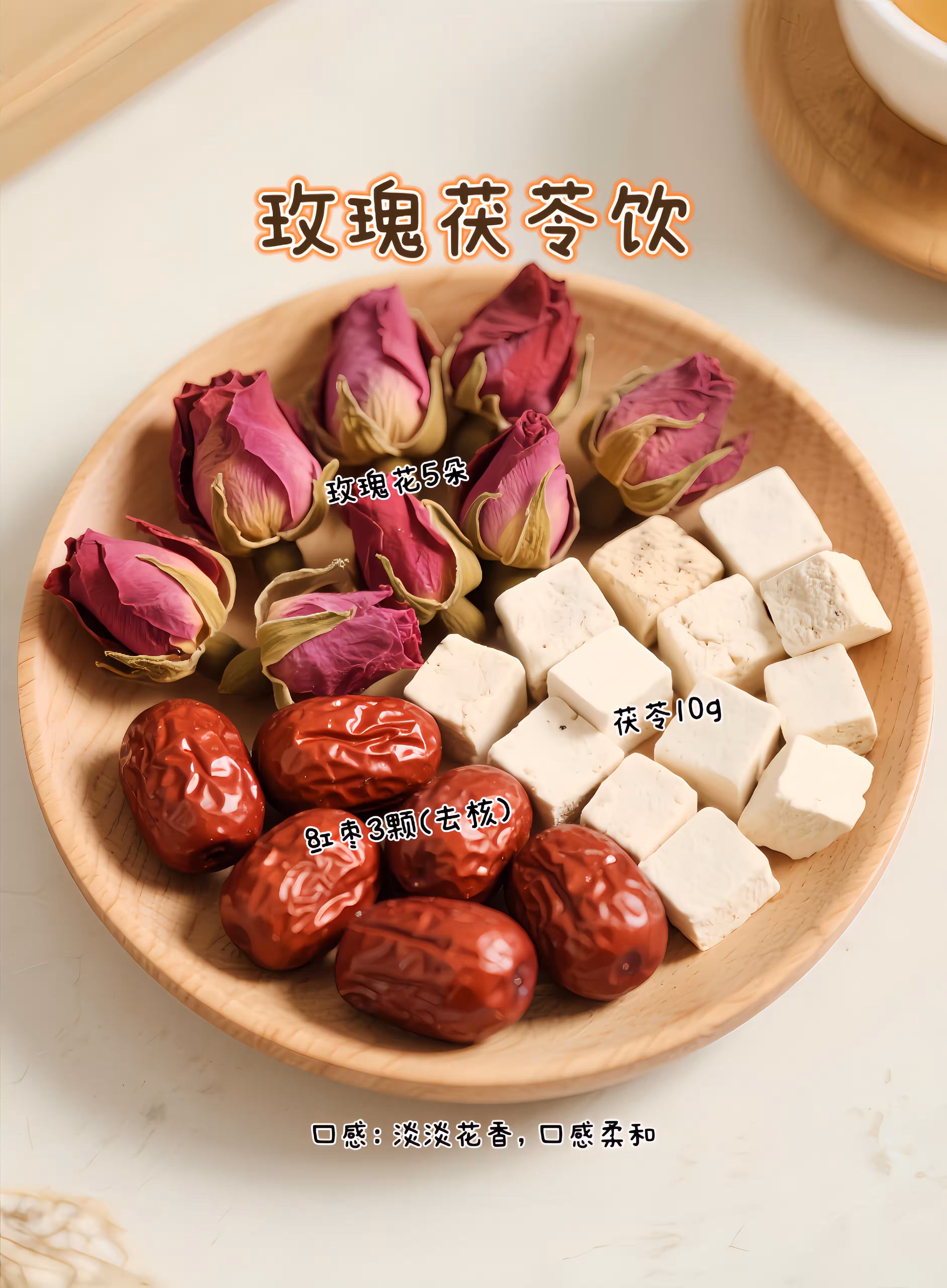 特點:玫瑰花香氣怡人,茯苓和紅棗帶來自然甘甜,晨起喝一杯溫熱的,幫助身體補充水分~
