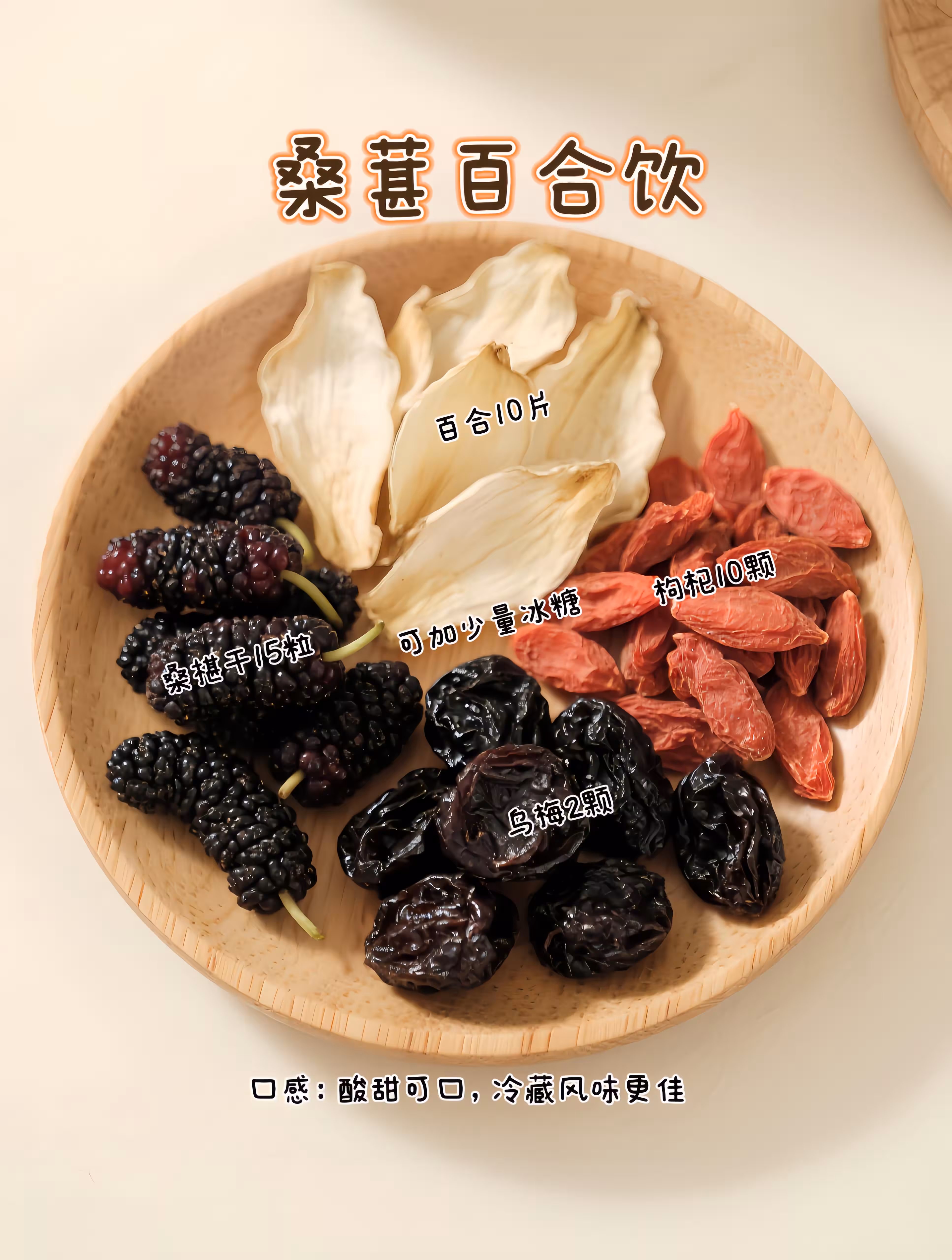 特點:桑葚、枸杞、百合都是溫和食材,搭配烏梅生津,適合作為日常滋養飲品,加班或追劇時喝很舒服~