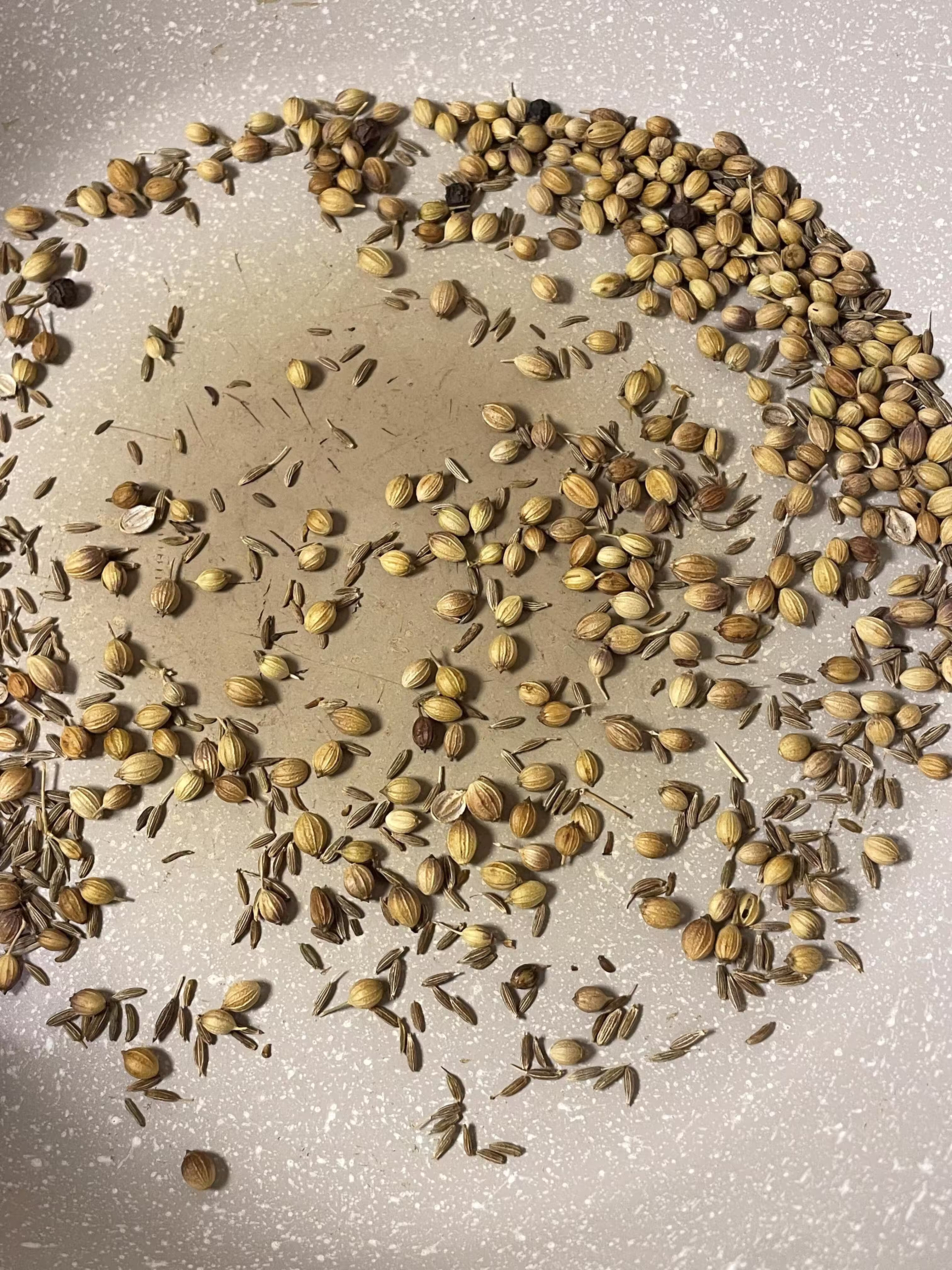 1. 干烤香料:香菜籽、孜然、黑胡椒小火干烘至香,用搗臼搗碎成粉