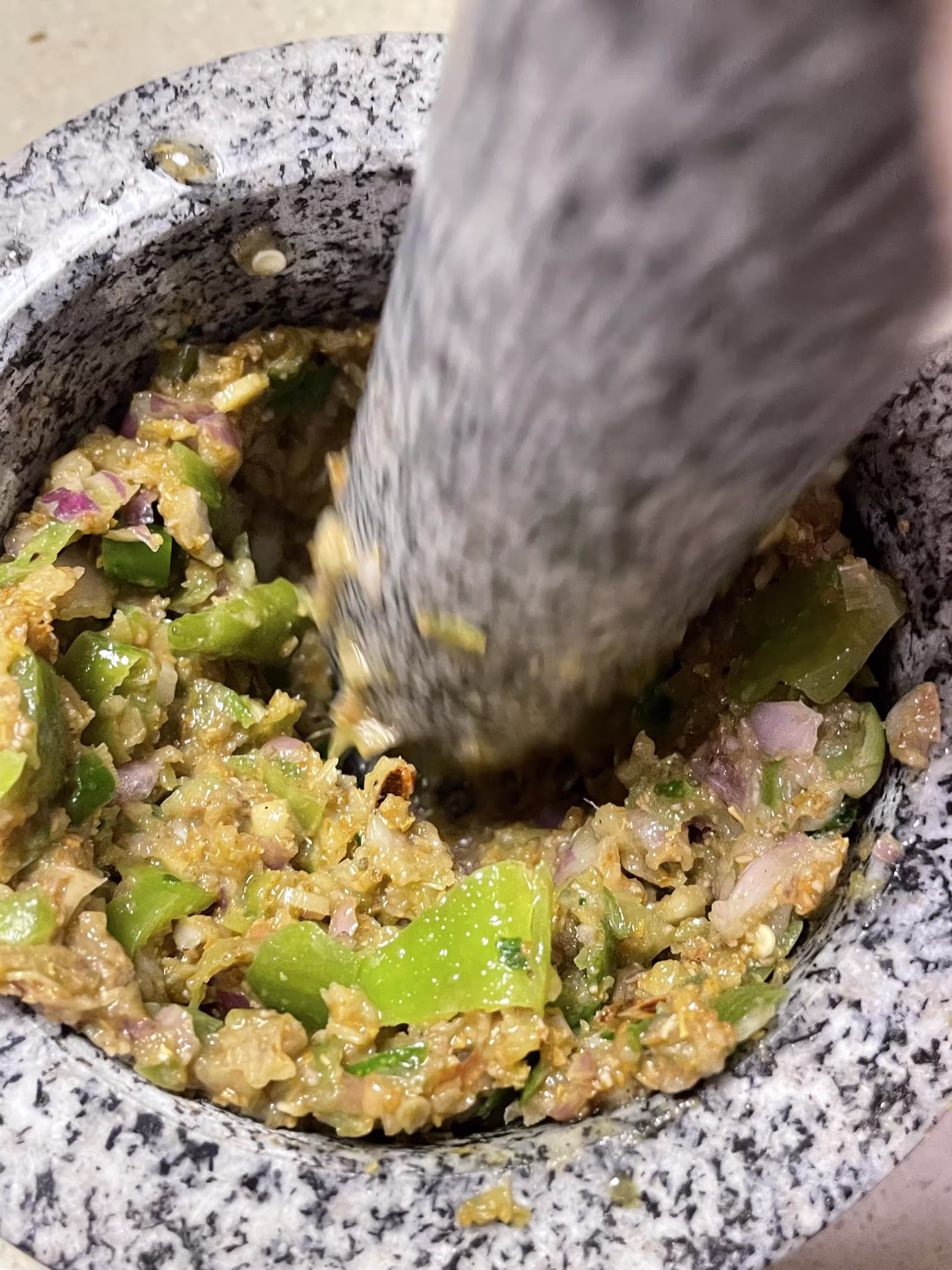 2. 放入鹽、大蒜、泰國綠辣椒、鳥眼辣椒、青檸葉、香菜根搗打成泥