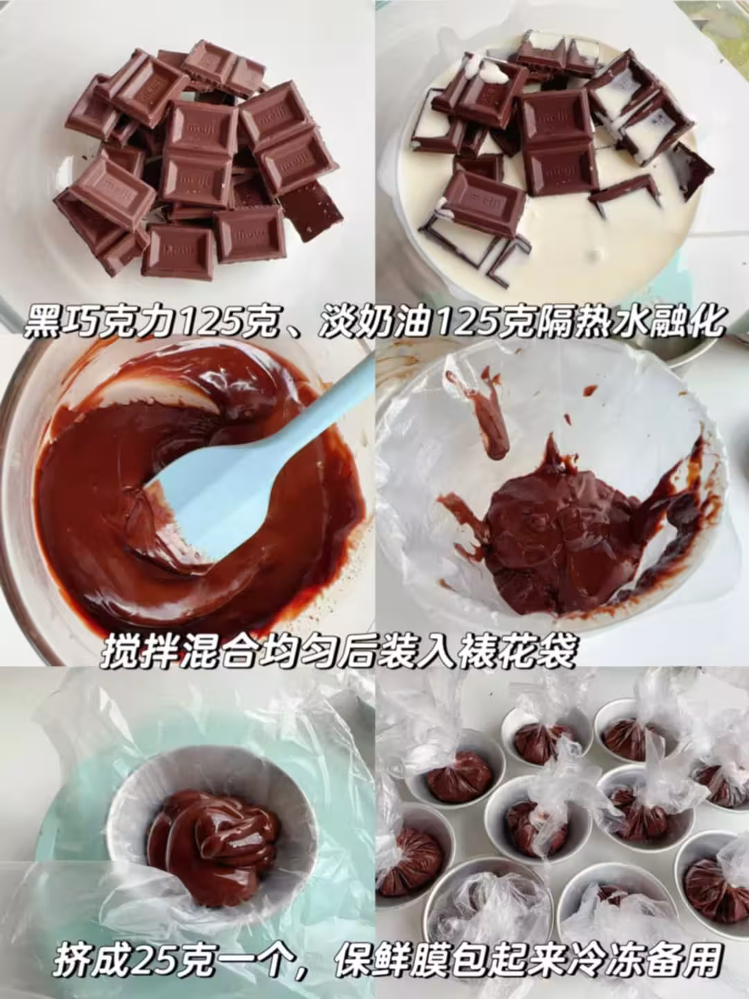 1⃣️先來做巧克力卡士達醬:黑巧和淡奶油放入碗中,隔熱水攪拌到完全融化為一體,倒入裱花袋。在蛋撻模具上放一張保鮮膜,擠入25克醬,一共10個,擰起來保鮮膜,送入冰箱冷凍備用;