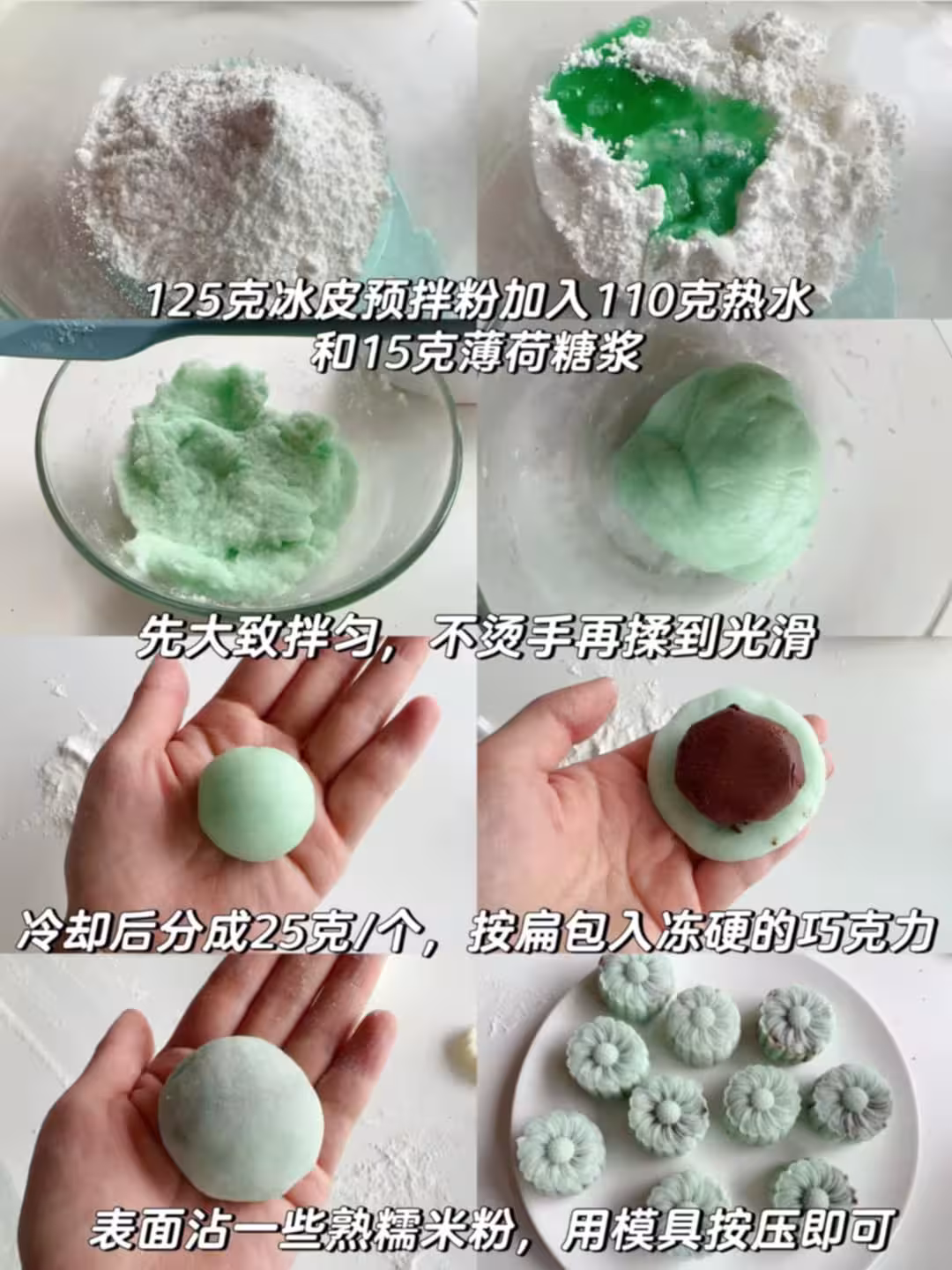 2⃣️冰皮粉中加入開水和薄荷糖漿,先用刮刀混合,不燙手再揉光滑。冷卻後分成25克/個,在手心揉圓按扁,包入凍硬的巧克力餡,收口收緊向下,表面沾一些熟糕粉,用模具按壓即可。