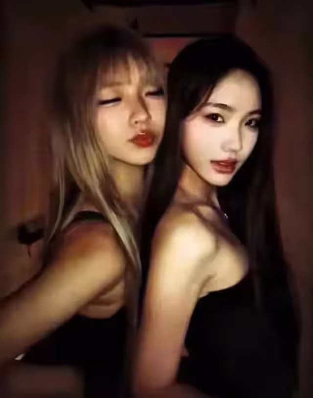 照片里姐妹倆濃妝艷抹,穿著黑色抹胸上衣,秀出不太豐滿的曲線。甚至有嘟嘴、拋媚眼的表情,真是有點艷俗了。