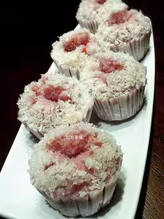 延續蔓越莓發糕雪國冬天白色的映像&情人節浪漫氛圍的主題, 構思了第二款發糕,一樣運用了當地食材 (覆盆子)。 無糖椰子粉深受小鬼們喜愛,覆盆子做出來是淡淡的粉紫色, 顏色很討喜。 訣竅提示 **用果凍模做成這樣迷你的小發糕,好入口,平常也可以當小朋友點心。 (每個果凍模=瑪芬模=100ml=約半個飯碗的粉漿量) ** 粉漿比例大概是這樣子: 在來米粉1: 低筋麵粉1,外加一點玉米粉增加口感, 水量約米粉+麵粉總和的90% , 糖量約水量的 50% (微甜,可依喜好增加到水量的70%), 1杯粉(總量) 對1 1/4小匙的泡打粉。