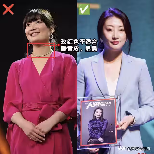 在沒搞清楚自己的肌膚色調前,也不能亂穿彩色,可以先從最好駕馭的基礎色或無彩色開始,你看宗馥莉一開始選的玫紅色就踩了個大雷,暖黃皮穿起來又土又俗;這不,後期她就換成了霧霾藍色西裝,高級又顯膚白,效果好多了。
