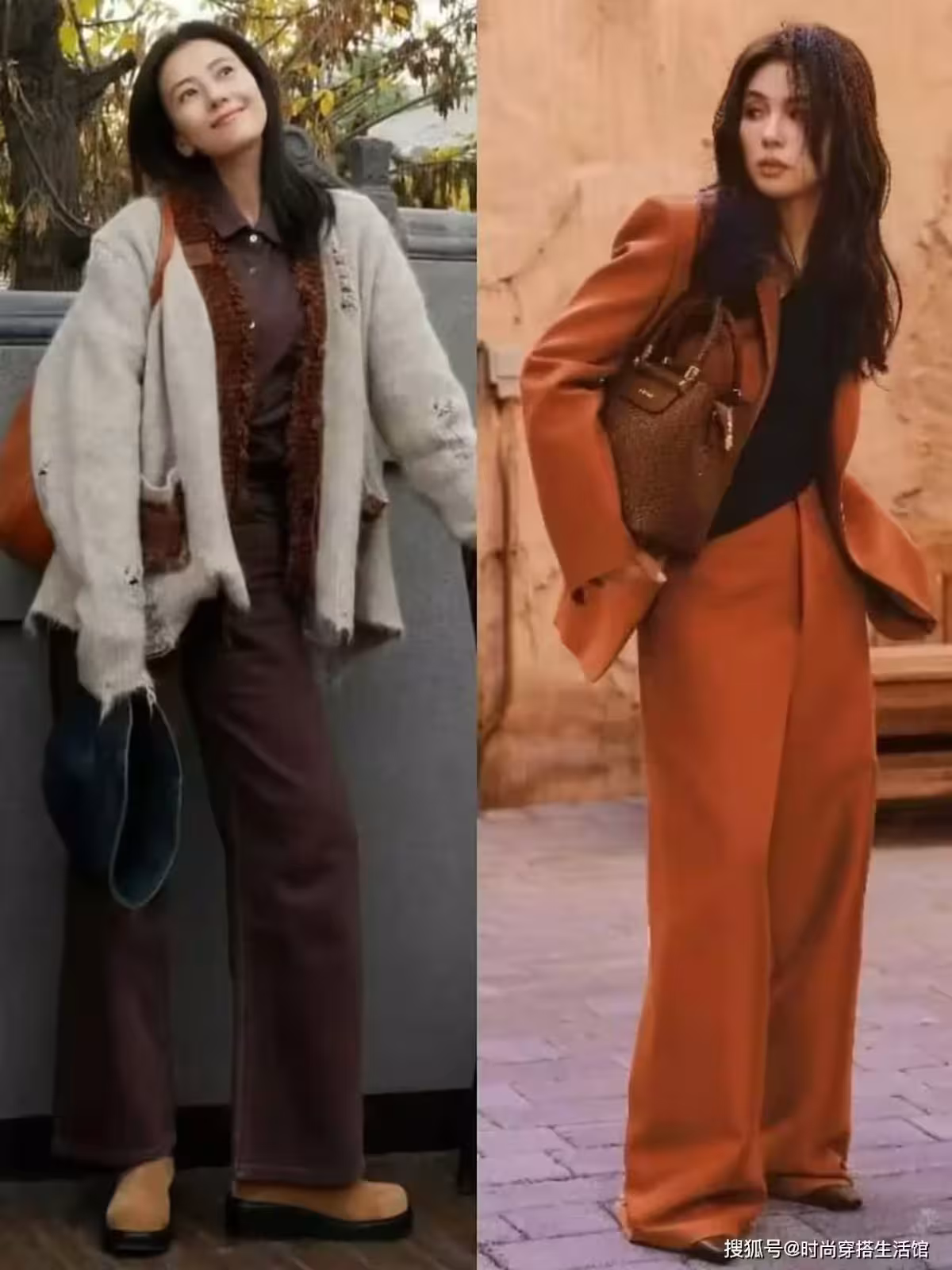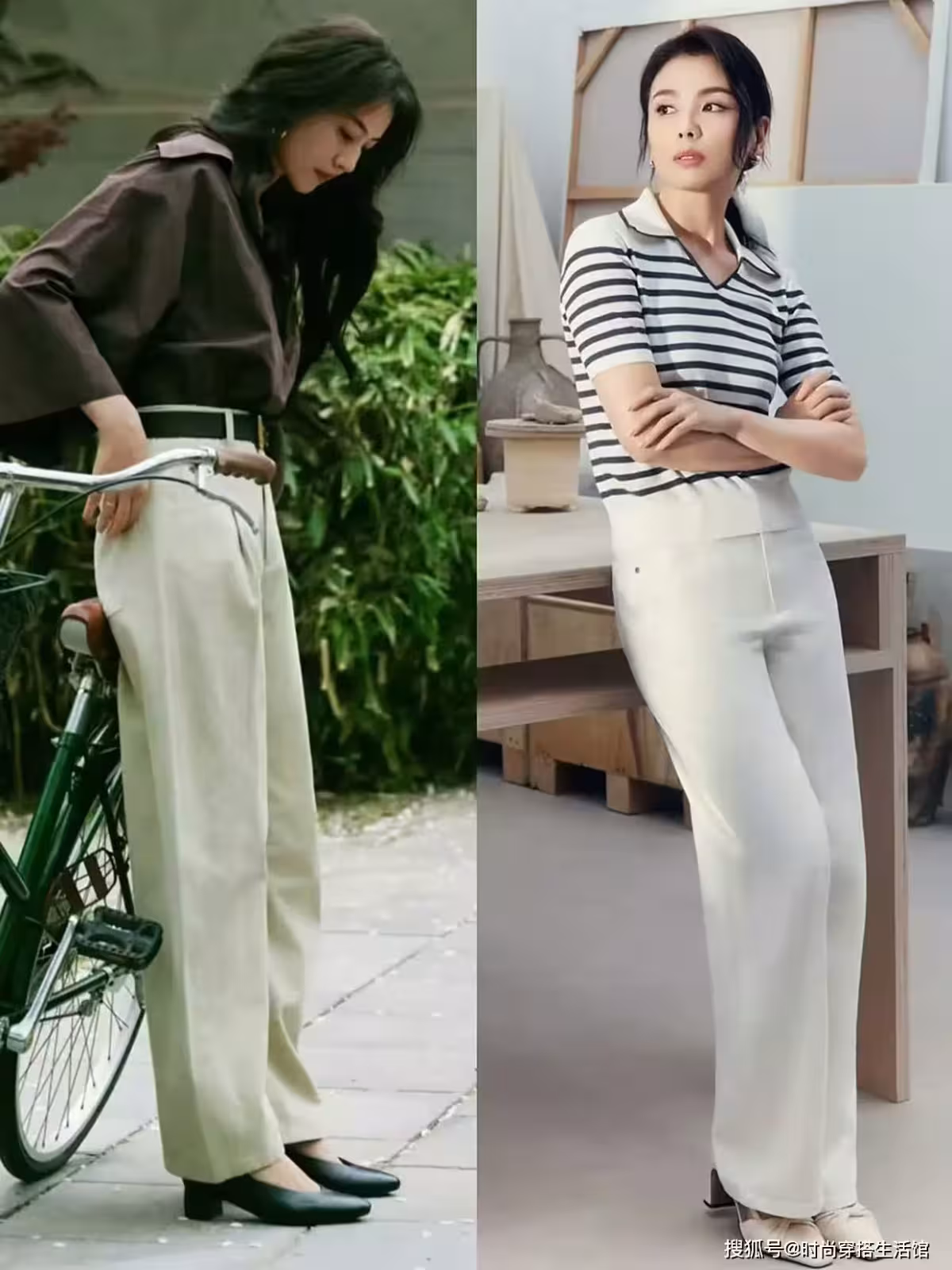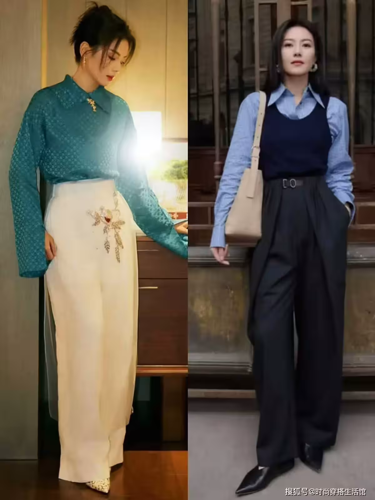 對於中年女性秋天穿闊腿褲非常注重腰線的選擇,畢竟穿同一條闊腿褲但是沒有塑造出高腰線的話就會讓我們的穿搭顯得五五分比例。我們可以看看劉濤、高圓圓的穿搭,她們選擇將上衣塞進闊腿褲,或者是選擇腰帶強調出腰線,瞬間就有效的拉長腿部線條,完全毫不費力就穿出高級感。