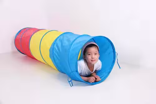 訓練要求:讓寶寶俯臥著身體,從隧道中爬行通過。