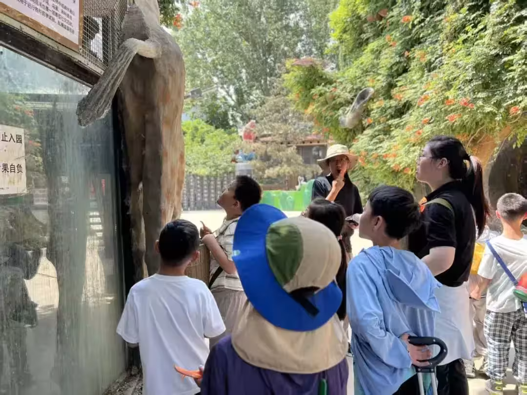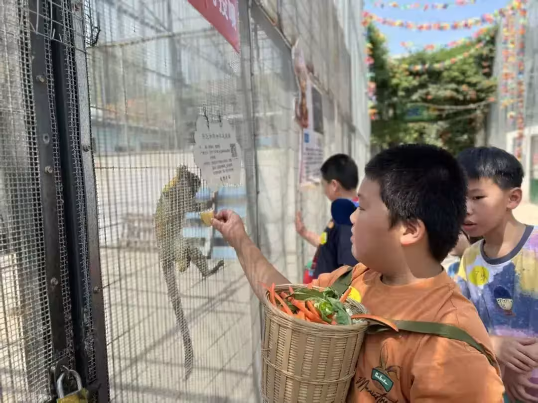 帶著青菜胡蘿蔔喂龍貓、羊駝、山羊、小猴子等小動物,用青菜引誘山羊抬頭吃草(視覺追蹤)、用玉米粒引導孔雀開屏(因果推理)。