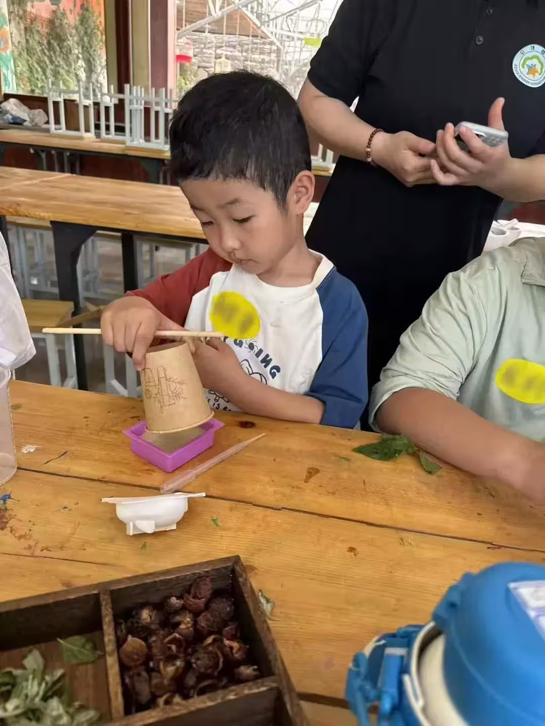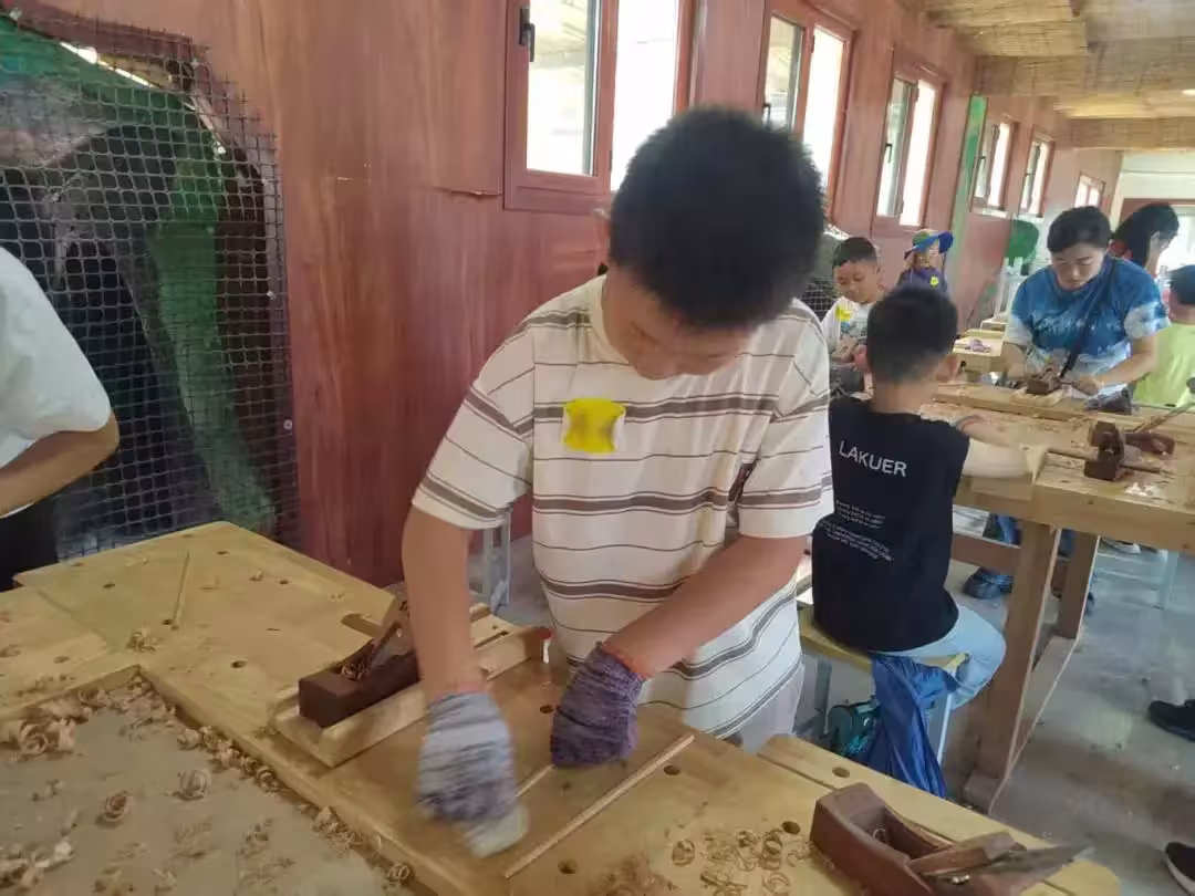 在自然材料區挑選適合的木材(松木/竹片),觀察年輪與紋理,用尺子測量尺寸,學習使用刨子打磨木材,砂紙由粗到細逐級打磨。