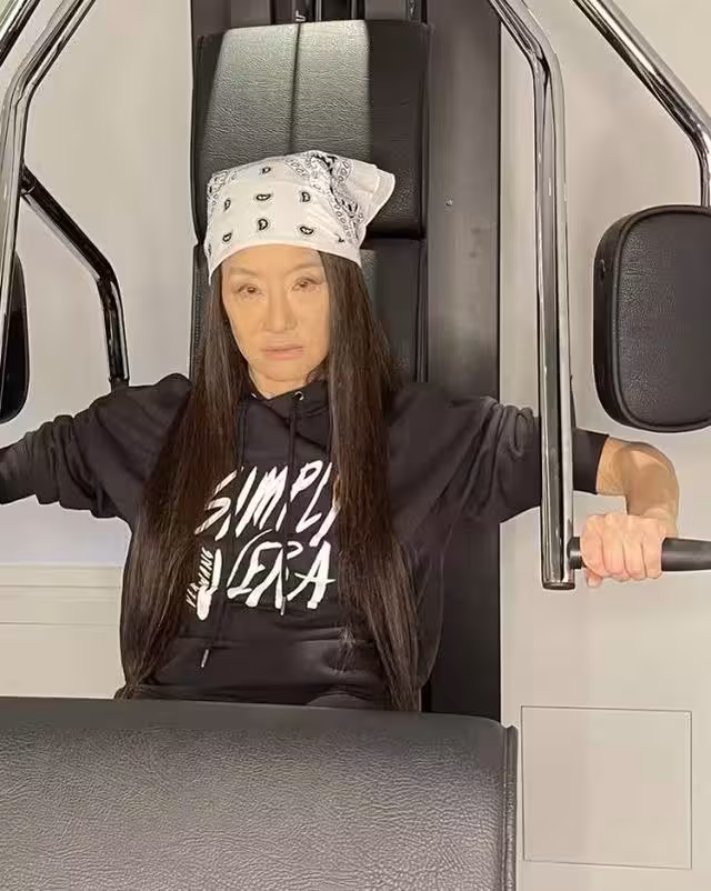對了上了年紀的女人來說,發福是基本逃不過的情況,而衛衣的材質又普遍硬,穿在發福的身材上,即使你只有120斤,也會看著像150斤。如下圖中的林青霞,穿著淺紫色的衛衣,就好胖的感覺,顯得頭小身體大。