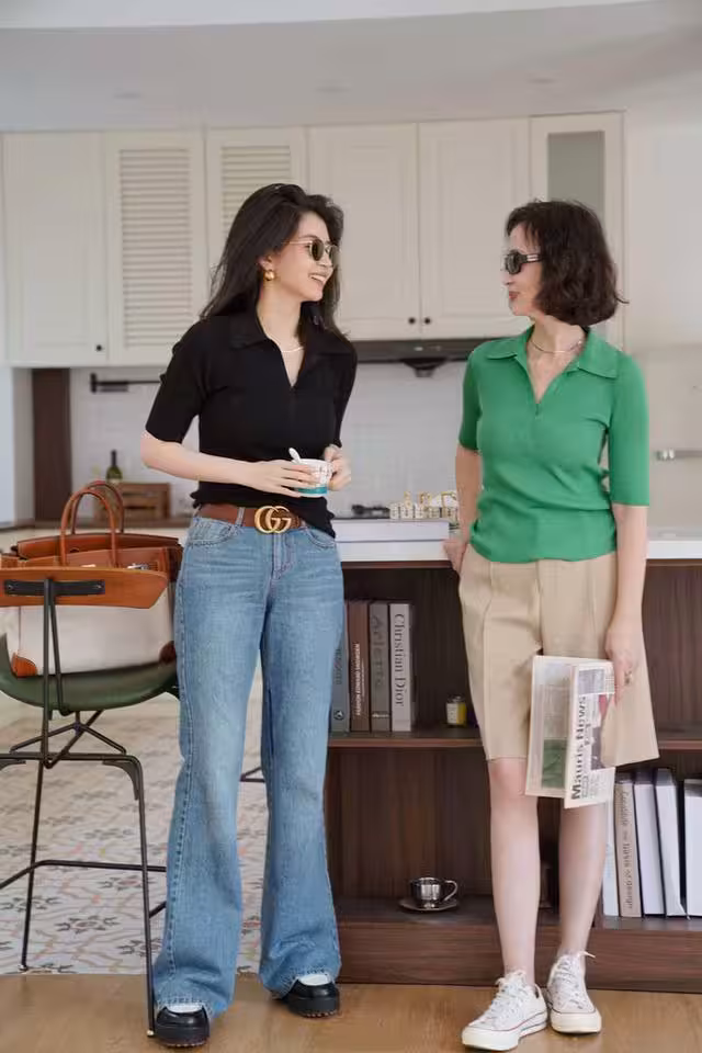 所謂無齡感的衣服,其實是指一些基礎款衣服,沒有特別的年齡印象,如T恤中的純色T恤,由於沒有能體現成熟度的印花,就無法從衣服上看出年齡,然後是色彩的選擇,選能襯自己膚色的顏色就好,如下圖中三木媽媽所穿的藍色半高領無袖T恤,就是無齡感T恤的代表。↓