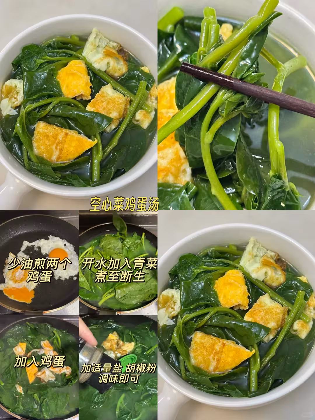 ✅第四款:空心菜雞蛋湯 準備食材:雞蛋、空心菜 配料:食鹽、胡椒粉
